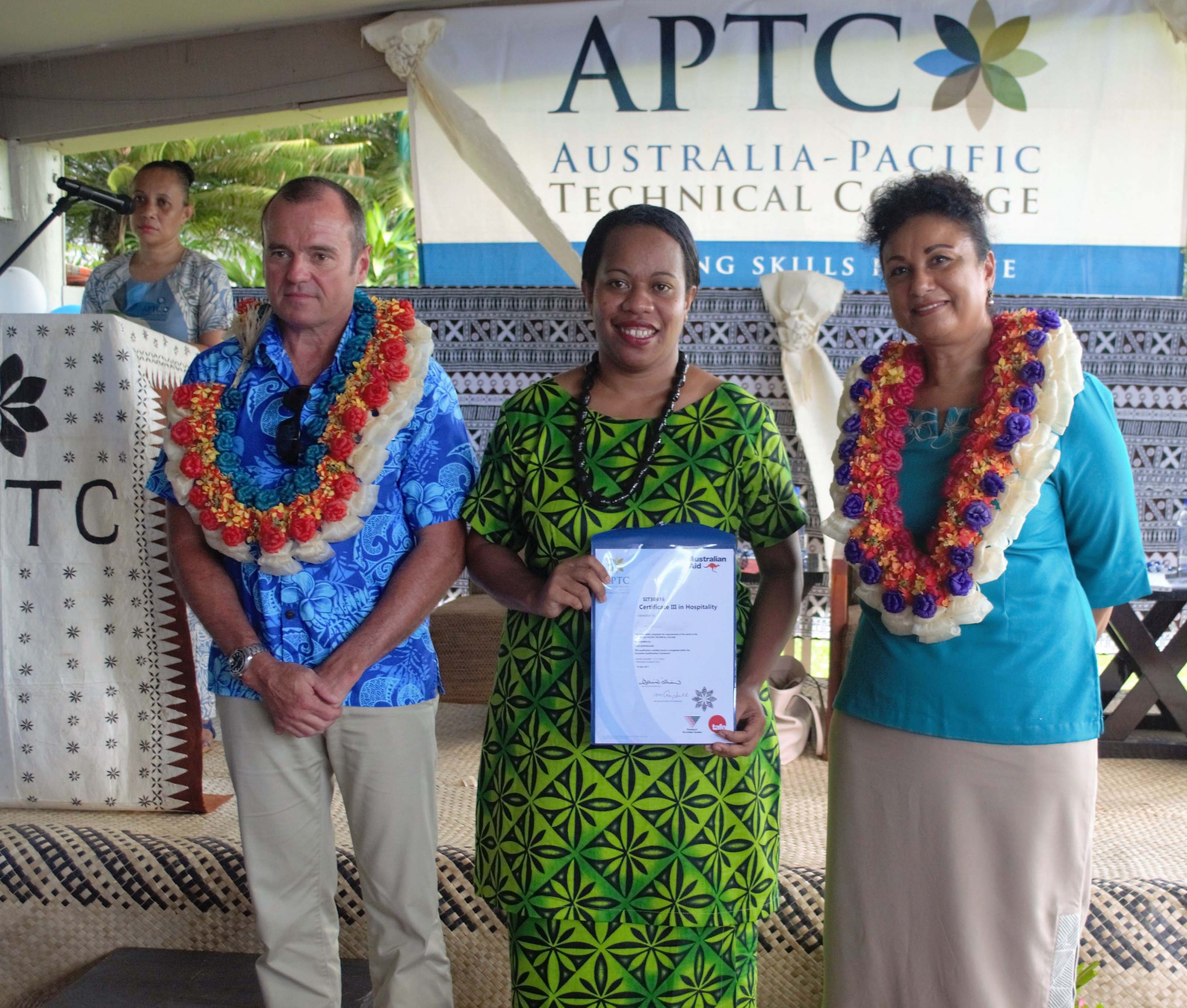 APTC graduate receiving certificate from Australian High Commissioner to Fiji, HE John Feakes and FHTA CEO, Fantasha Lockington during the APTC graduation ceremony in Nadi.
