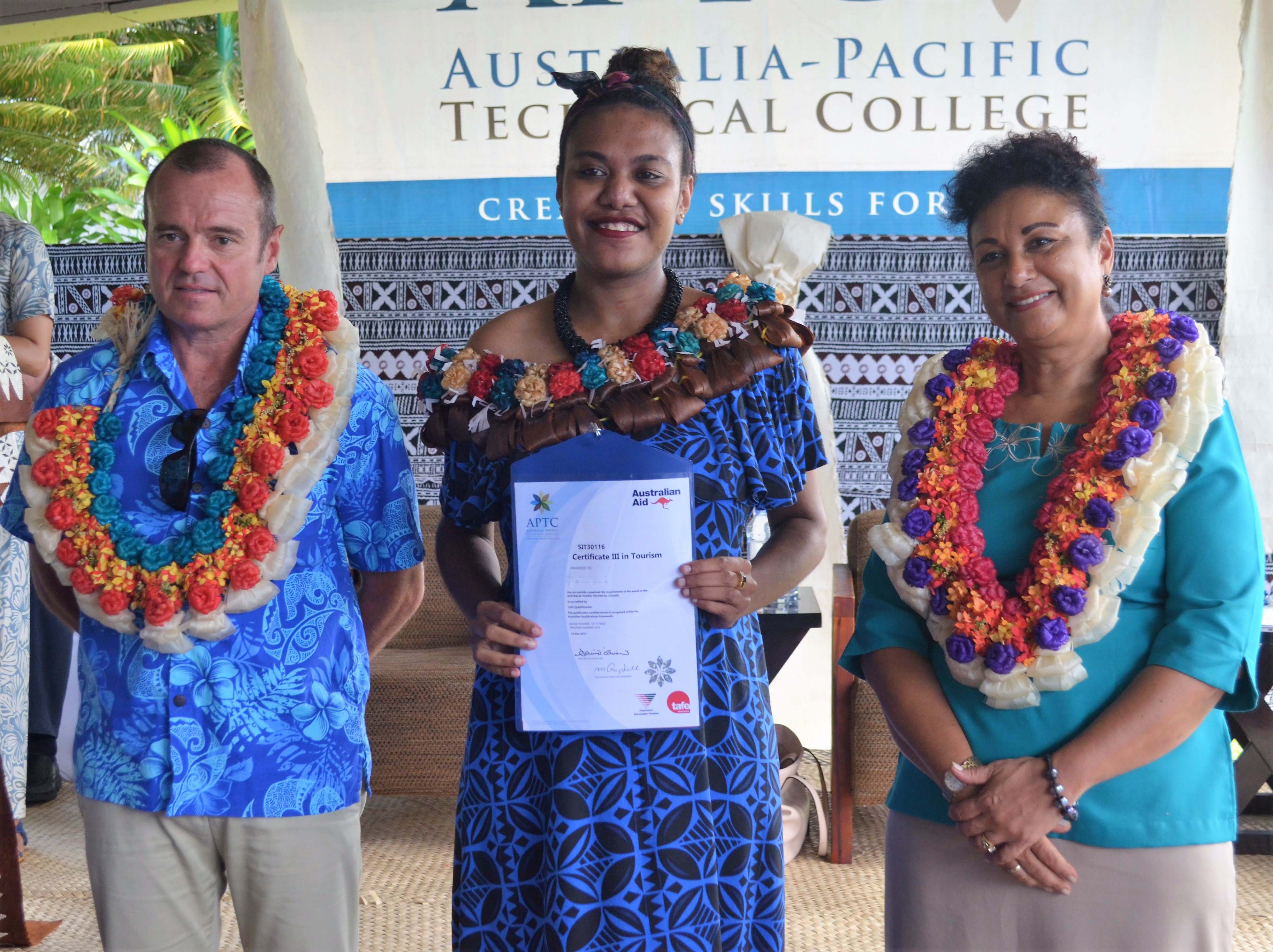 APTC Certificate III in Tourism graduate, Kalesi Bari (centre) with Australian High Commissioner to Fiji, HE John Feakes and FHTA CEO, Fantasha Lockington during the APTC graduation ceremony.